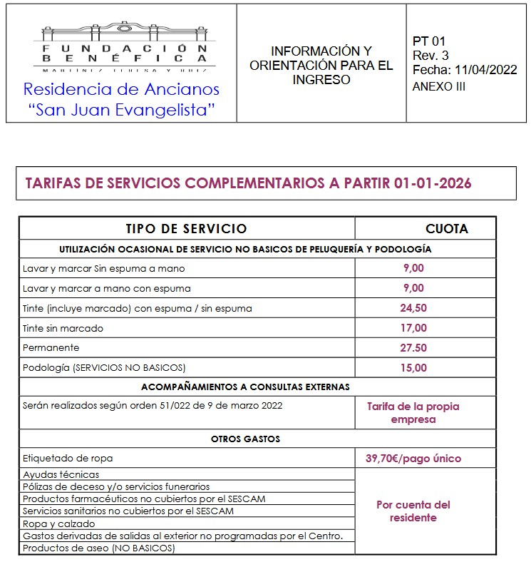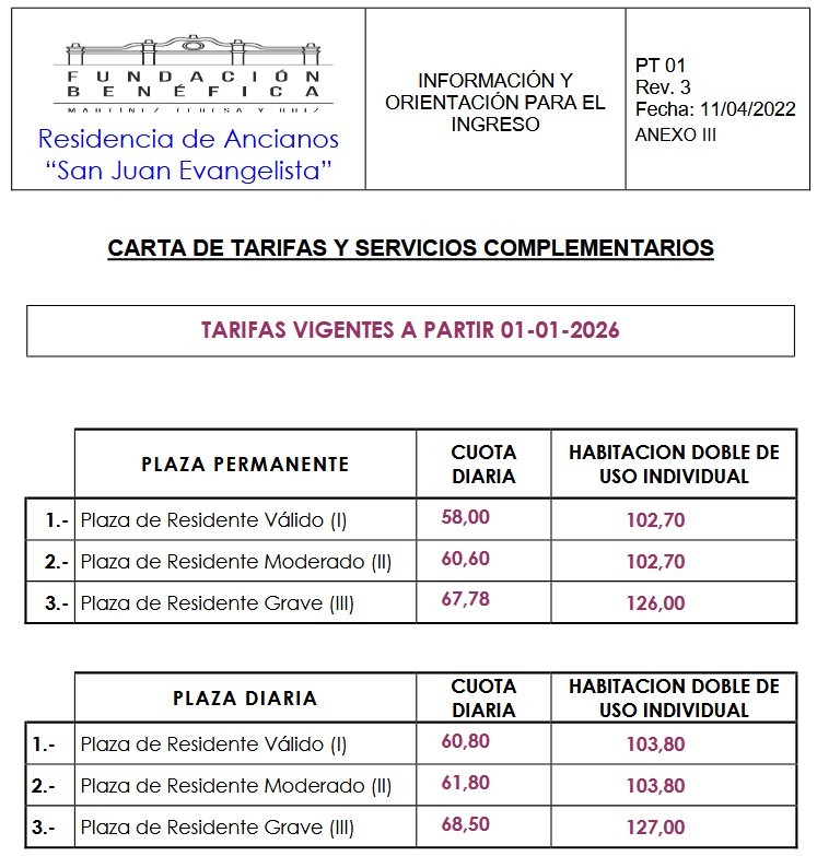 La Residencia de Ancianos «San Juan Evangelista» cuenta con 2 tipos de estancias: públicas y privadas. Igualmente, las personas que atendemos presentan distintos grados de autonomía, desde la plena hasta personas que necesitan ayuda (asistidos).